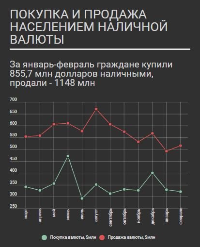 Белорусы в феврале увеличили продажу наличной валюты на 4,8% — до 515,6 млн долларов, а вот интерес к приобретению валюты упал на 2,9% по сравнению с прошлым месяцем — до 321,1 млн долларов наличными. 015.by »